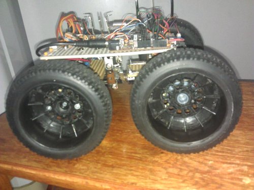 Pentru deplasarea robotului au fost modificate pentru rotatie continua 4 servomotoare, acestea avand un cuplu mare, fapt ce ajuta la deplasarea robotului pe teren accidentat. Pentru a transmite cuplul la sol s-au folost 4 roti de automodelism. Aceste roti sunt realizate din cauciuc aderent si de asemenea au un profil ce ajuta la cresterea aderentei pe diverse suprafete. Tot pentru a mari mobilitatea robotului pe teren accidentat s-a optat pentru realizarea unui sistem cu punti independente astfel incat puntea fata se poate misca independent de puntea spate fapt ce ajuta la pastrarea contactului cu solul a rotilor.