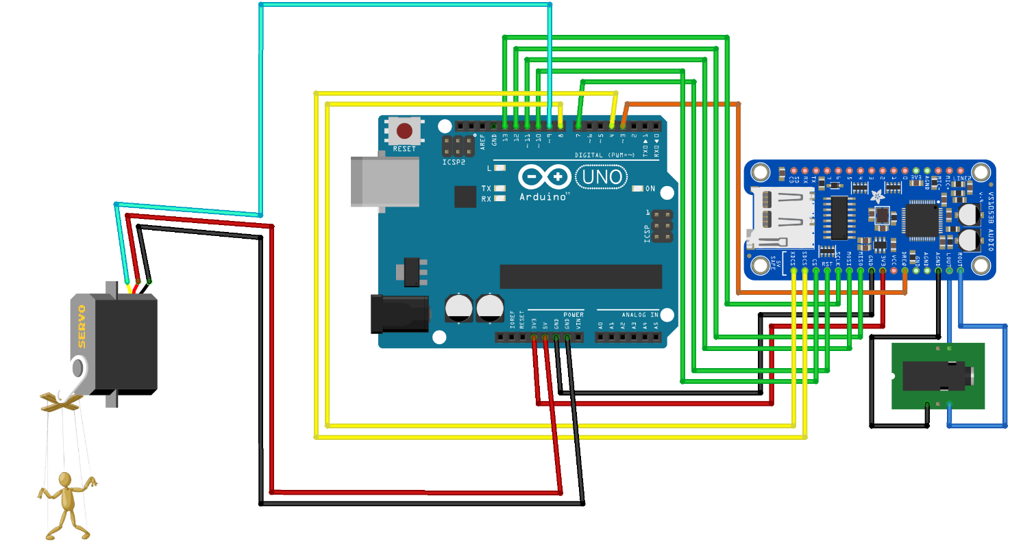 Multe aplicații de divertisment necesită combinarea redării audio cu comanda unei mișcări care, cel mai adesea, este implementată cu ajutorul unui motor electric. În cadrul proiectului de față vom vedea cum putem realiza acest lucru: redarea unei piese audio și comanda simultană a unui servomotor (a fost ales acest tip de motor deoarece este un motor ce poate realizări mișcări de precizie – se poate ușor modifica exemplul pentru un alt tip de motor electric).