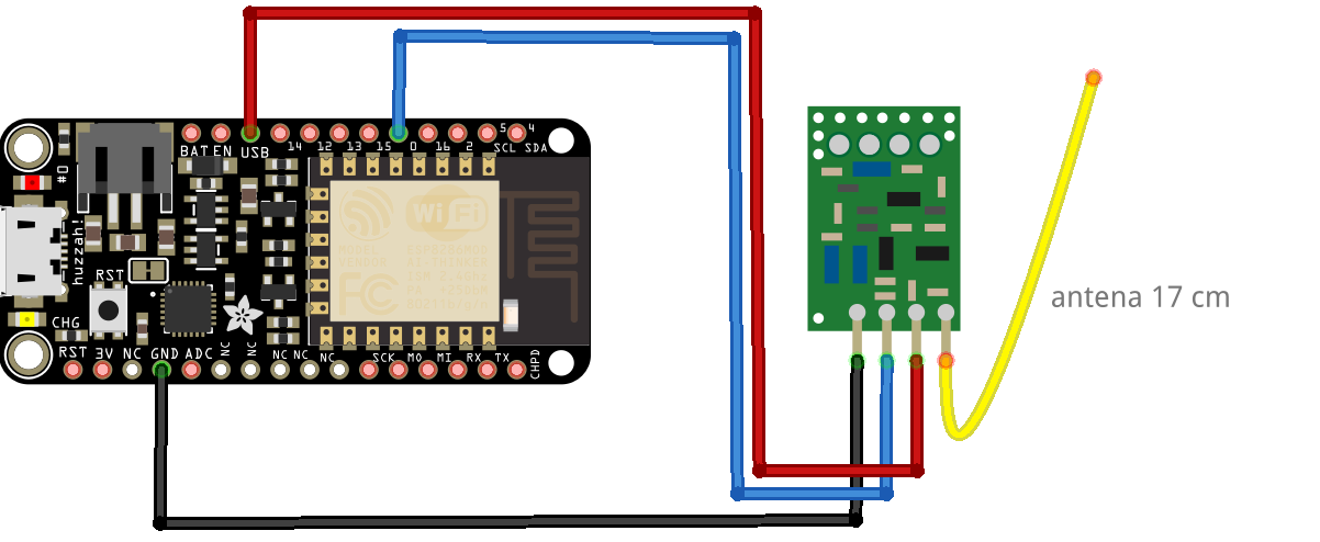 Emițătorul radio funcționează la o tensiune de 5V și din acest motiv este alimentat de la pinul USB (tensiunea furnizată de conexiunea USB a plăcii) – sistemul nu va funcționa corect dacă placa de dezvoltare este alimentată de la un acumulator. Pinul de date al emițătorului se va conecta la pinul 0 al plăcii de dezvoltare. Pentru mai multe informații despre instalarea și utilizarea plăcii Adafruit Feather HUZZAH puteți consulta: