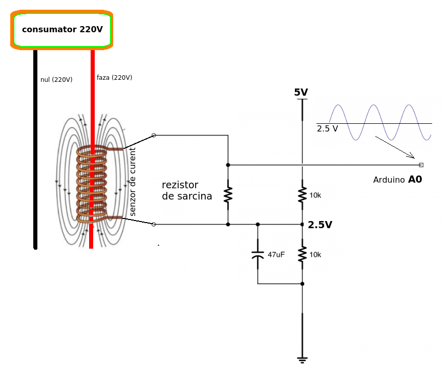 Foarte scurt, bobina senzorului se trece in jurul unuia dintre firele de alimentare de 220 (nul sau faza), iar curentul alternativ de 220V induce in bobina senzorului un curent alternativ, care este masurat folosind placa Arduino, pe un rezistor de sarcina.