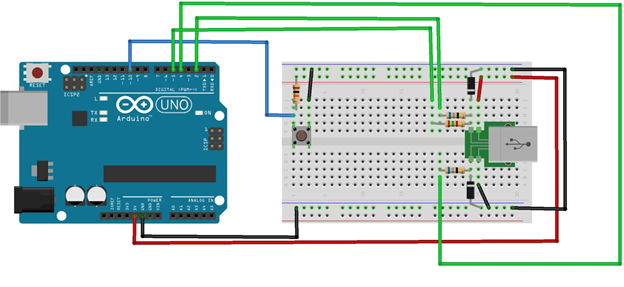 Butonul este conectat la pinul digital 10, acesta este ținut la Vcc (+5V) prin intermediul unei rezistențe de 10Kohm. Apăsarea butonului trage pinul digital în ”0” logic (0V). Conexiunea electrică USB presupune ca liniile D+, D- să aibă o rezistență de 68ohm în serie și câte o diodă Zener de 3.6V la masă (pentru adaptarea nivelului logic de 5V la 3.6V). Linia D+ necesită și o rezistență de pull-up de 1.5Kohm comandată de pinul digital 5. Linia D- se conectează la pinul digital 4 și linia D+ la pinul digital 2. Liniile conexiunii USB Vcc și GND se interconectează la pinii 5V și GND ai plăcii Arduino asigurând alimentarea sistemului în modul de funcționare periferic USB de tip HID. Schema de interconectare este următoarea: