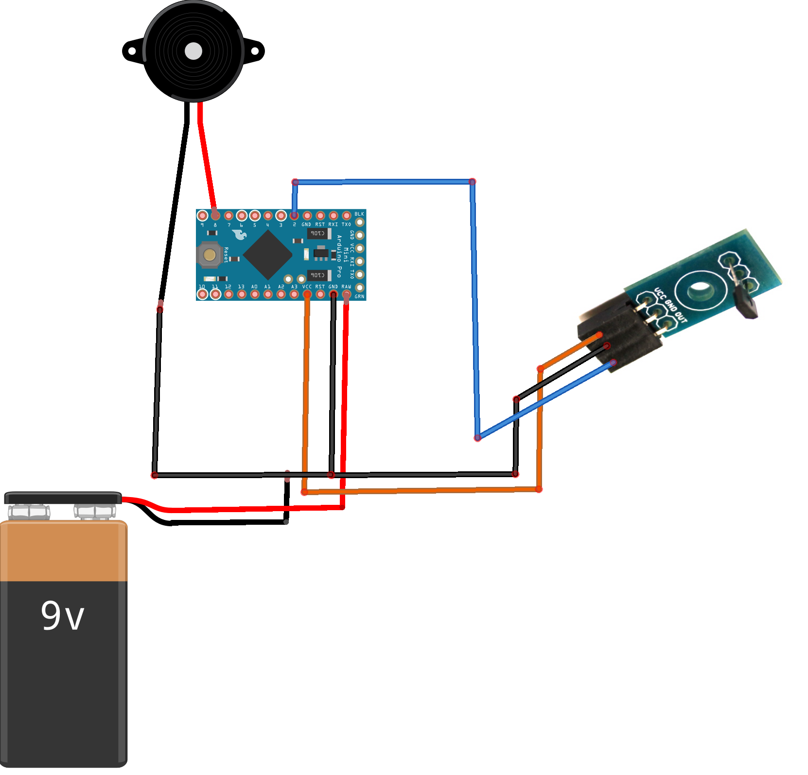 În cazul în care dorim să micșorăm dimensiunea sistemului antifurt putem înlocui placa de dezvoltare Arduino Uno cu o placă Arduino Pro Mini. În plus putem alimenta sistemul de la o baterie de 9V și pentru a prelungi durata de funcționare vom configura microcontrolerul să funcționeze în regim de consum redus. Noua schemă de interconectare este: